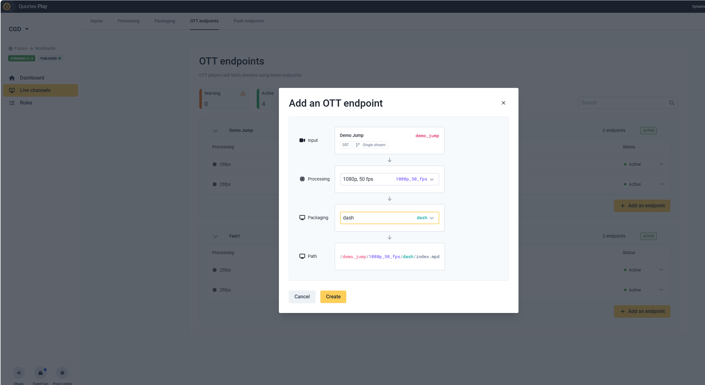 Within a few clicks, configure your input stream, select processing and packaging settings from templates or customize your own to build your OTT endpoint.